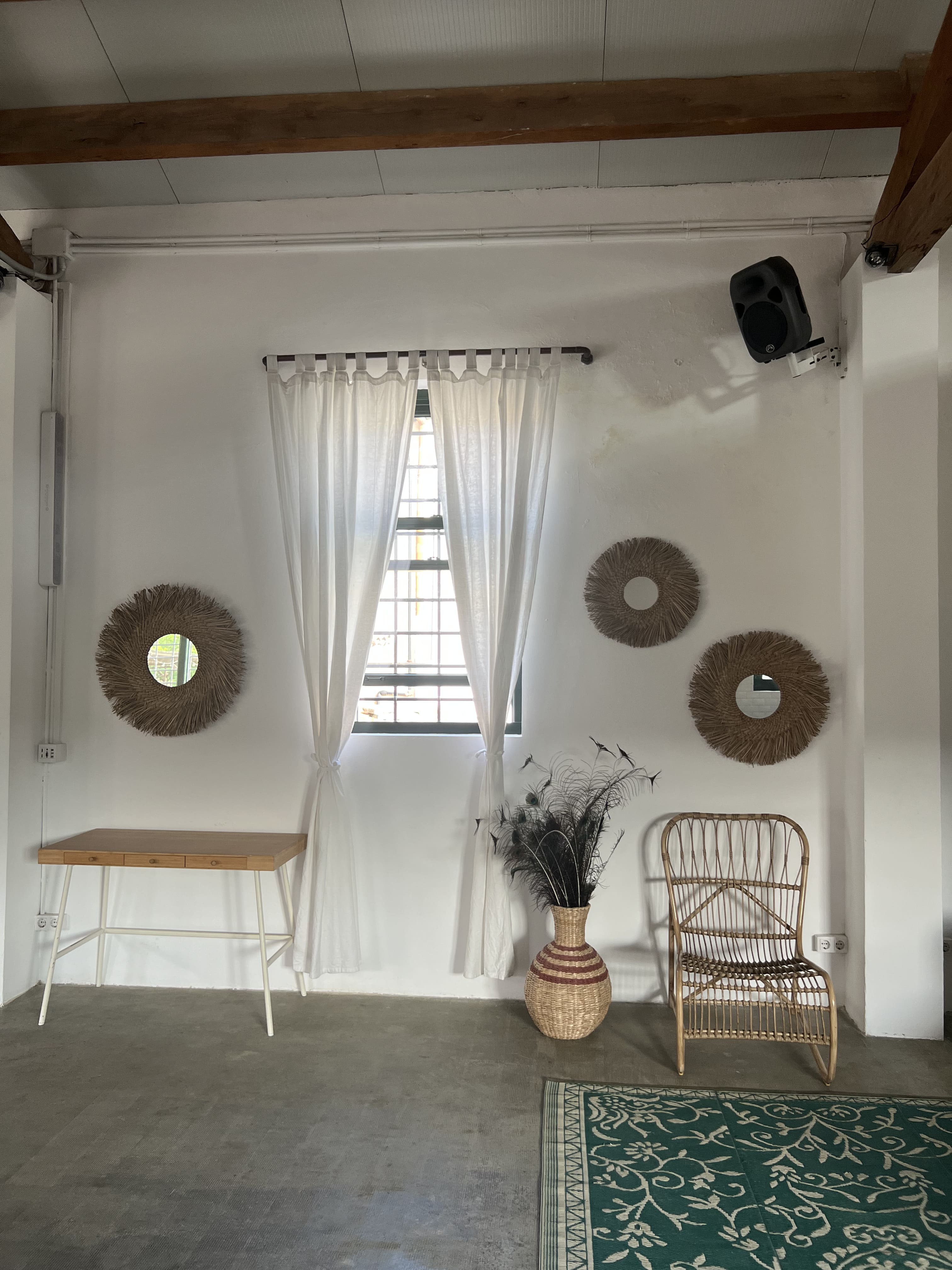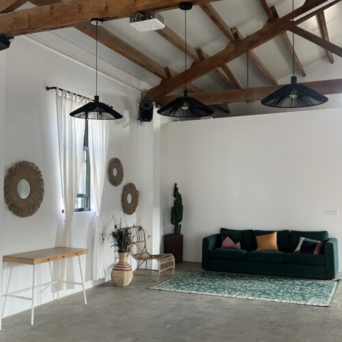 Un ESPACIO INTERIOR de 95 m2, diáfano, con techo abuhardillado de 5 m, luminoso y a pie de calle. Con cocina equipada, lavabo completo adaptado, equipo audiovisual con adaptadores para PC, barra de sonido, altavoz, iluminación, mobiliario, mesas y sillas.